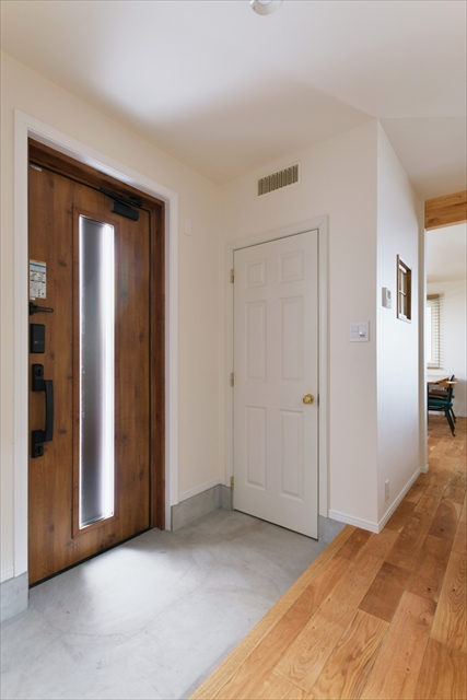 何かとモノがあふれがちな玄関も素敵なドアで仕切ってスッキリと。