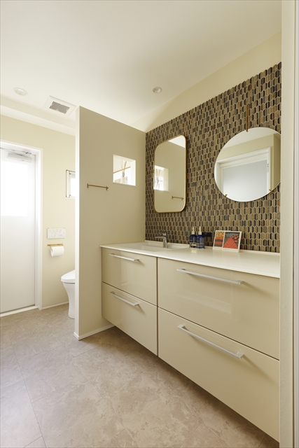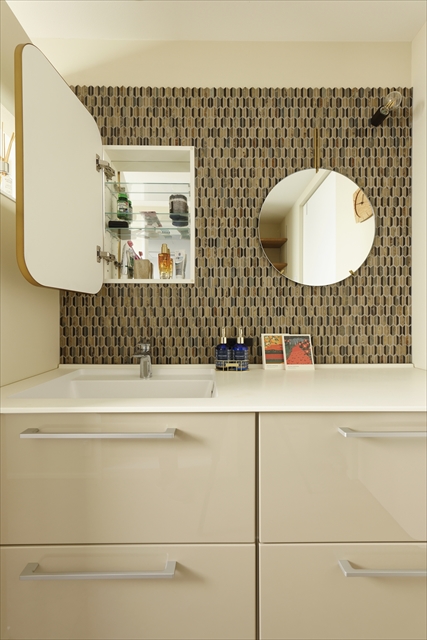 モザイクタイルが見事なサニタリースペース。角丸長方形のミラーは開けると中に収納があり、何かと小物が散らばりがちな洗面台もスッキリと保てます。オープンなトイレスペースがなんとも海外流。空間が広く感じられます。