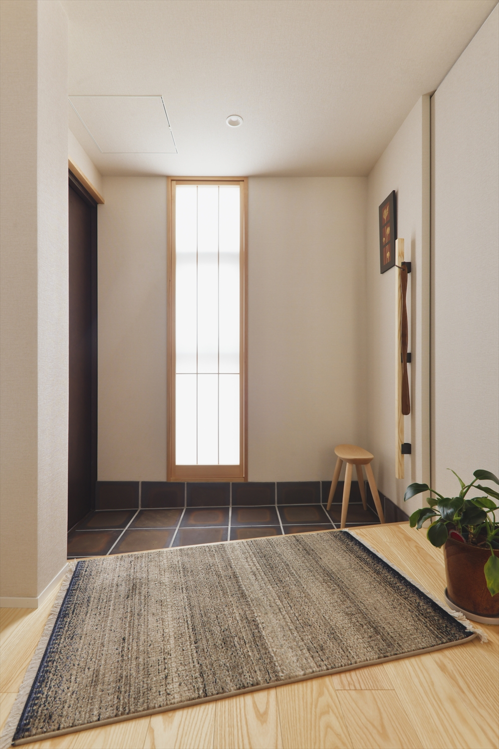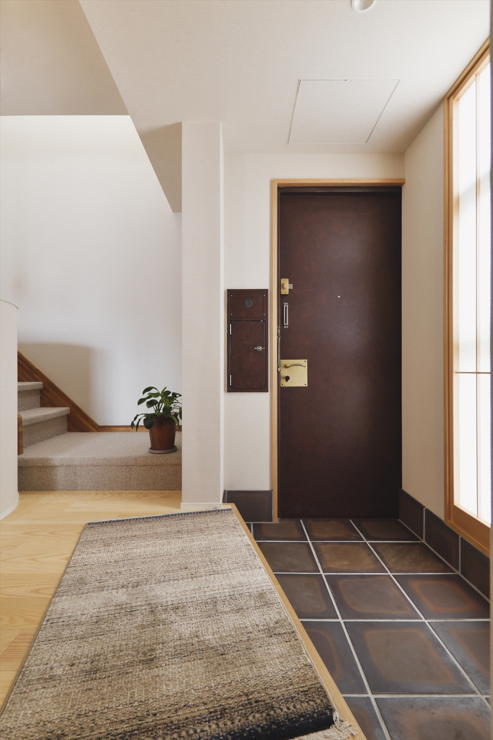 窓からやさしい光が差し込んでくる玄関。統一感のある玄関ドアとタイルがしっとりと馴染んでいます。