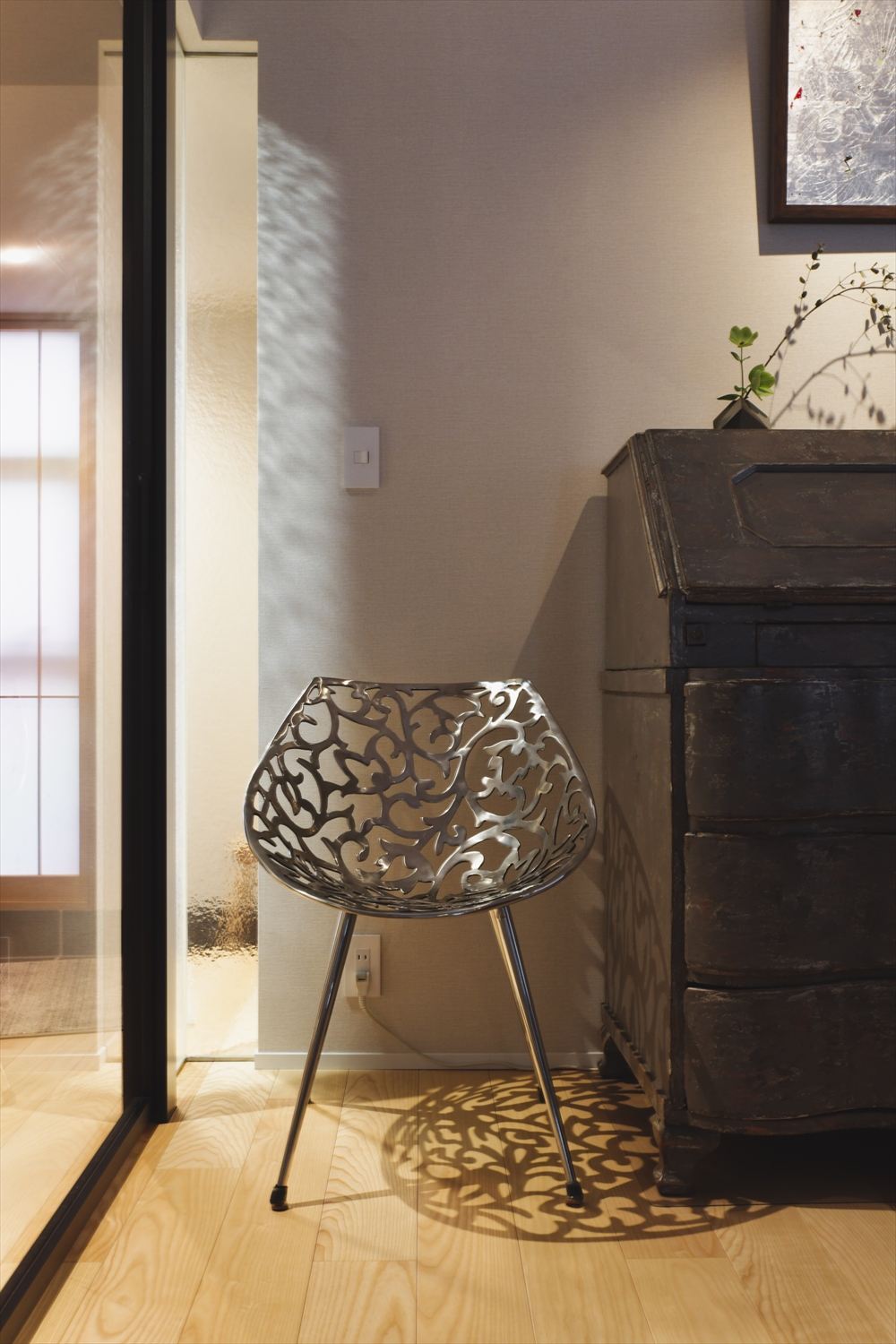 灯りがともると、床に椅子の繊細な透かし模様の影が描かれ、一層洗練された空間に。