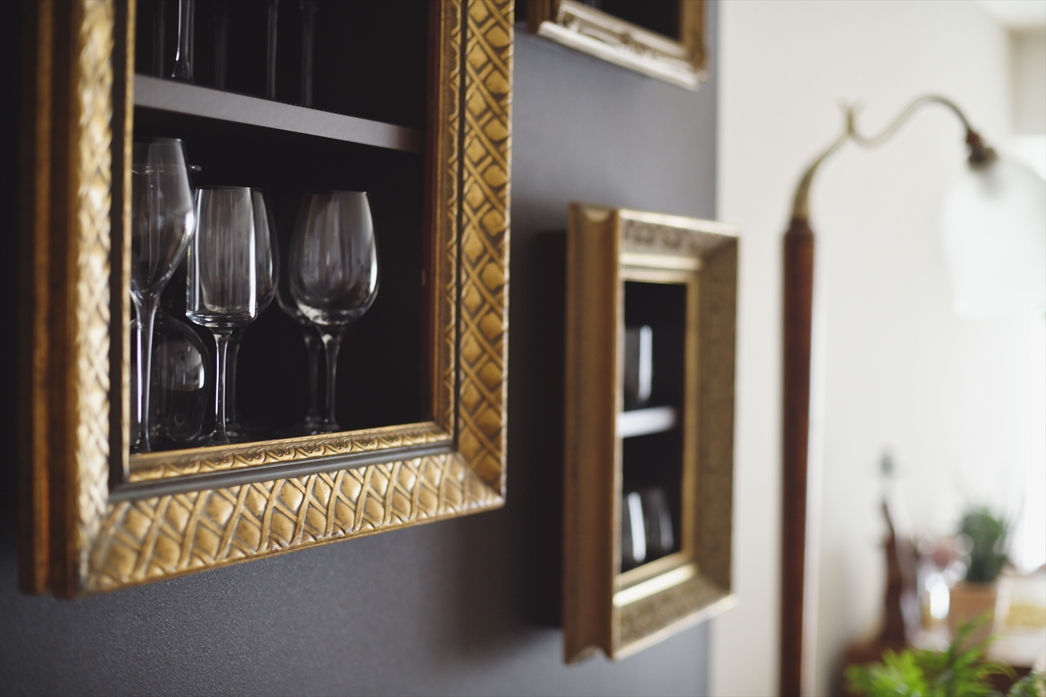 LDKのグレーの壁にある額縁の中には…なんと本物のワイングラス!