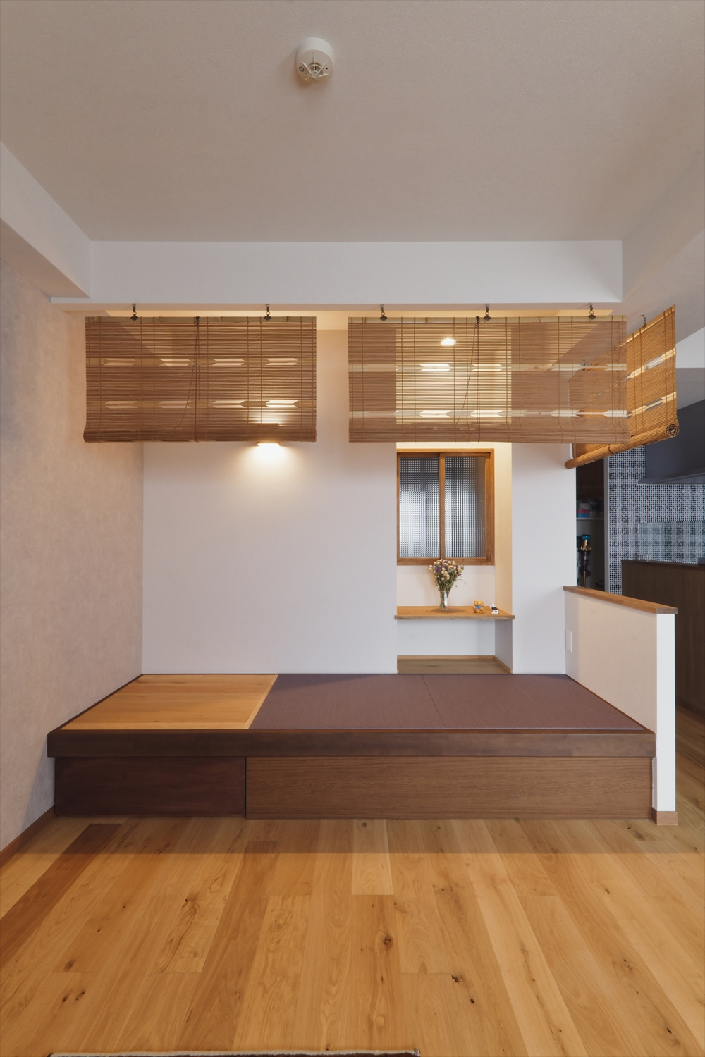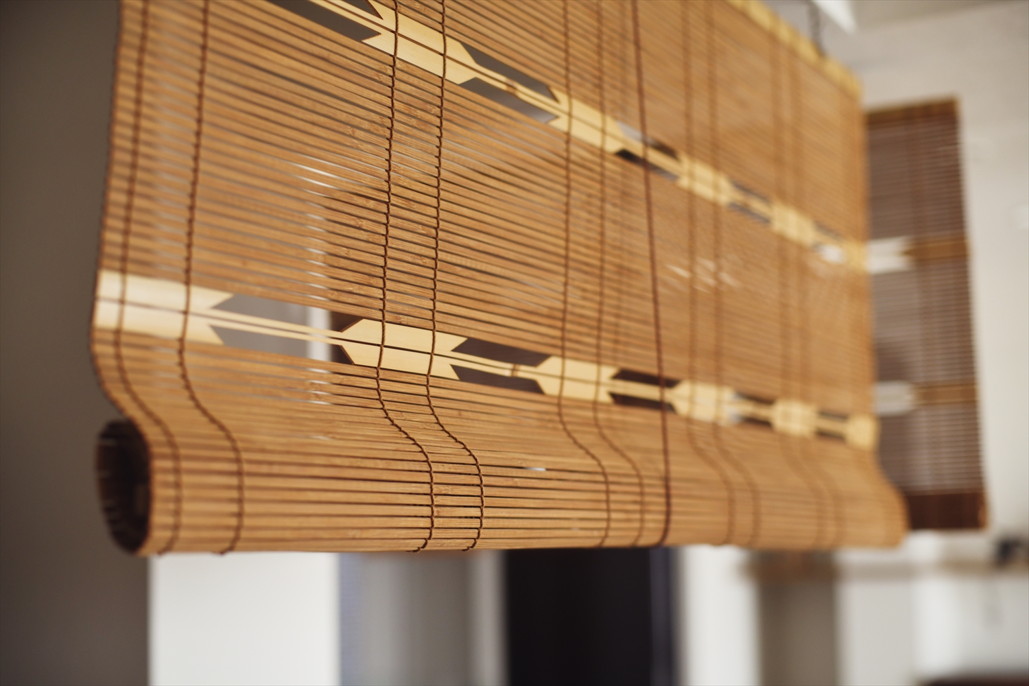 リビングの小上がりの目隠しとして使われているすだれはため息がでるほどの美しさ。