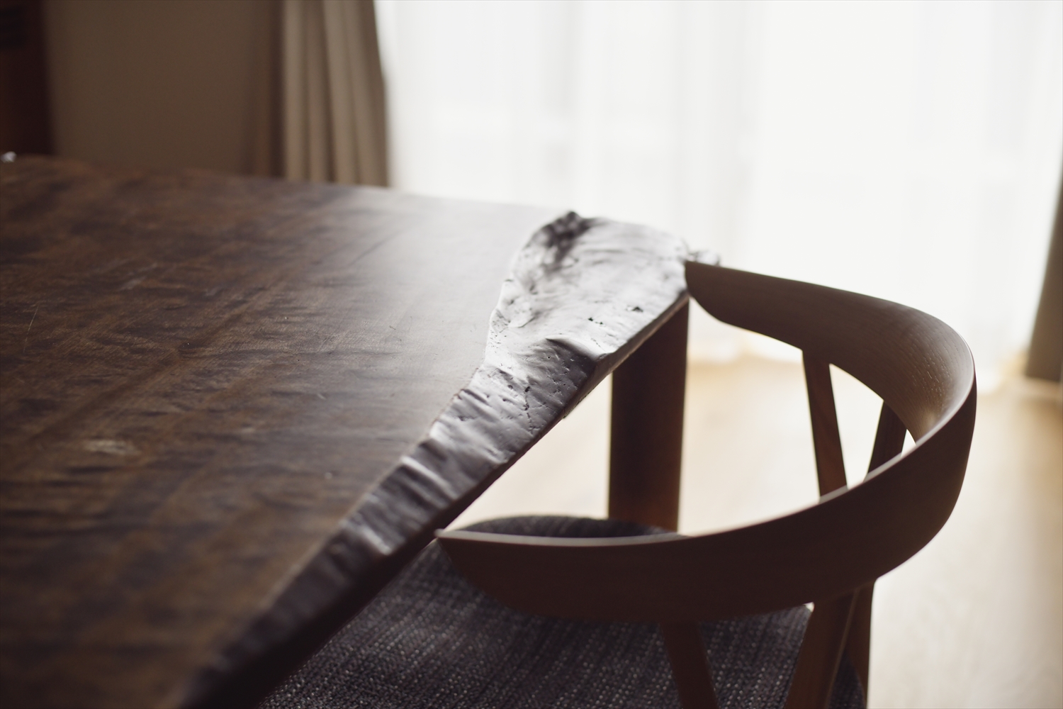 こちらのトチの木のダイニングテーブルの天板が、ご実家で使われていた座卓をリメイクしたもの。長い年月を経た味わいと柔らかさが感じられますね。