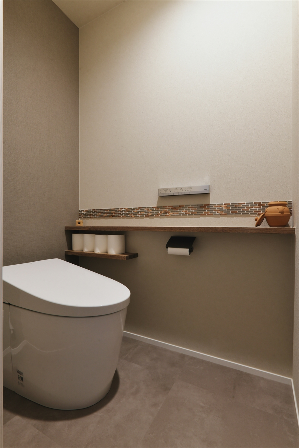 トイレの壁を彩るモザイクタイルは、小さなブリック(レンガ)を並べたようなデザインと、