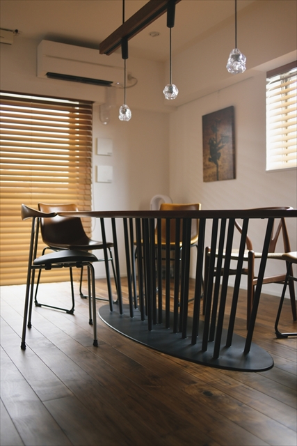 ダイニングテーブル上部の照明バーも木製にするなど、床から天井まで隙なく統一された、