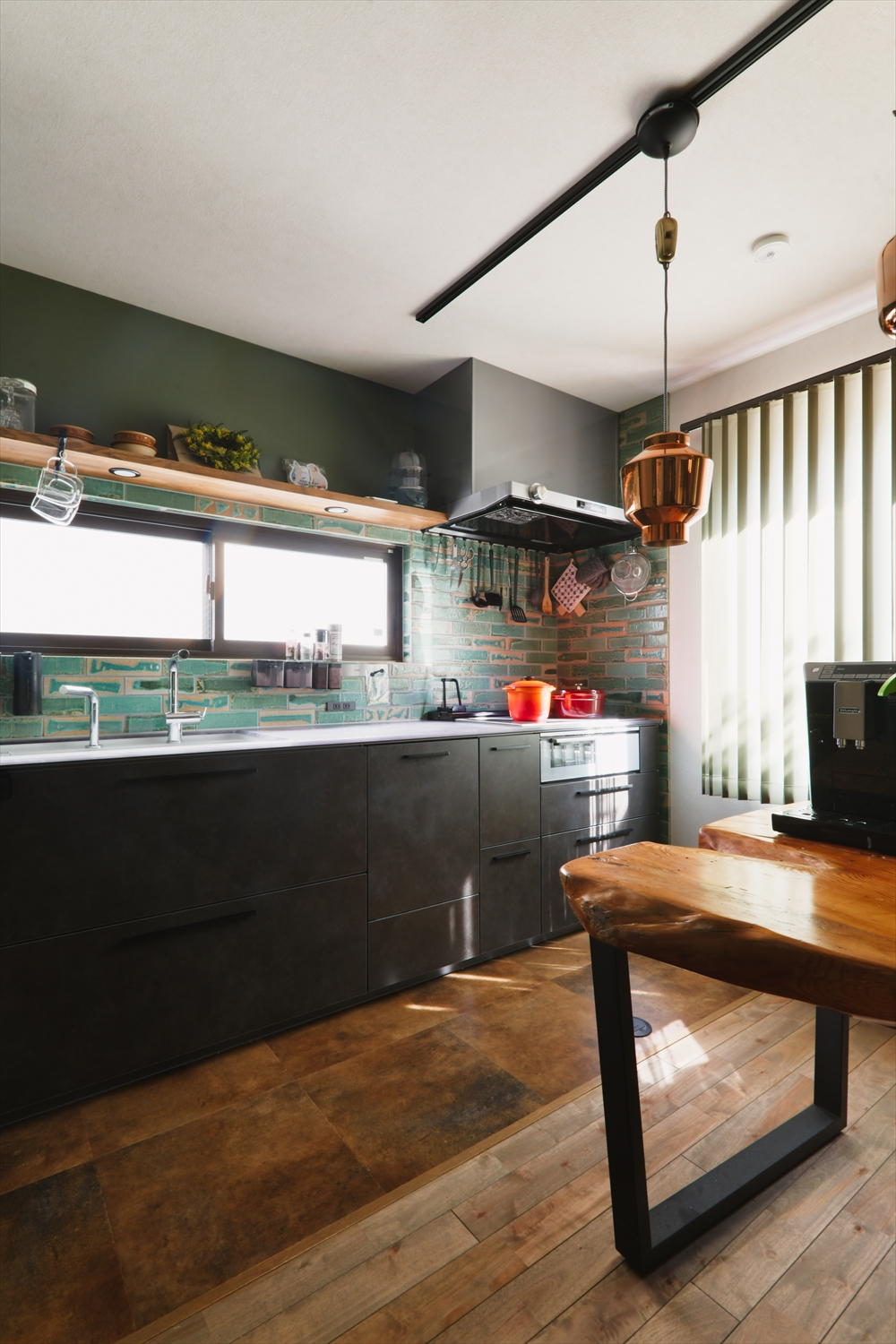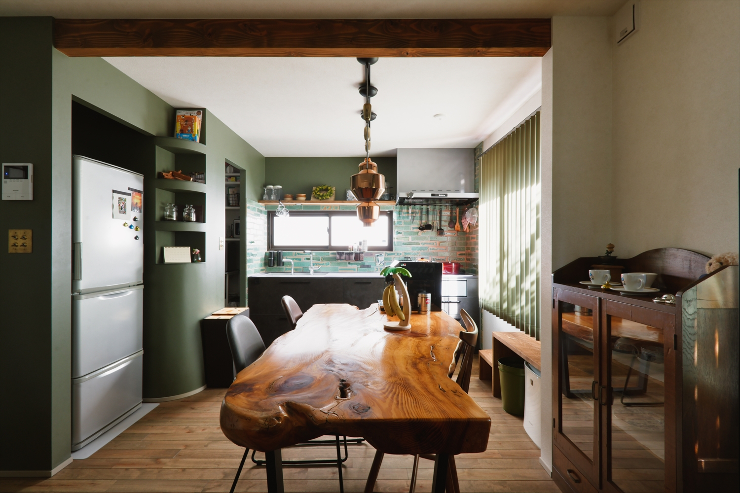 冷蔵庫の隣のまあるいニッチに飾り棚や、グリーンで統一されたバーチカルブラインドが