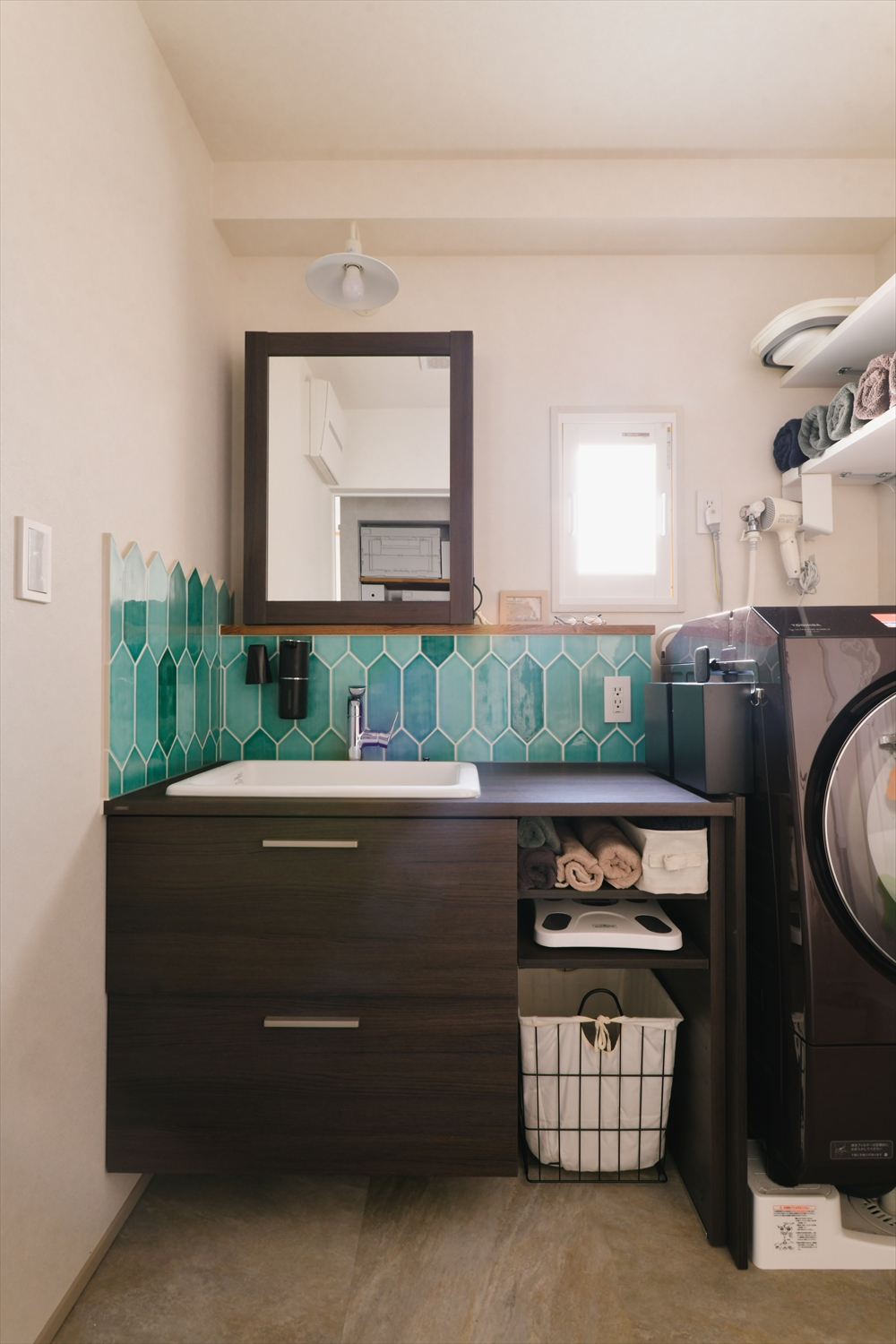 洗面も、グラデーションのように表情豊かなグリーンタイルがとても印象的です。