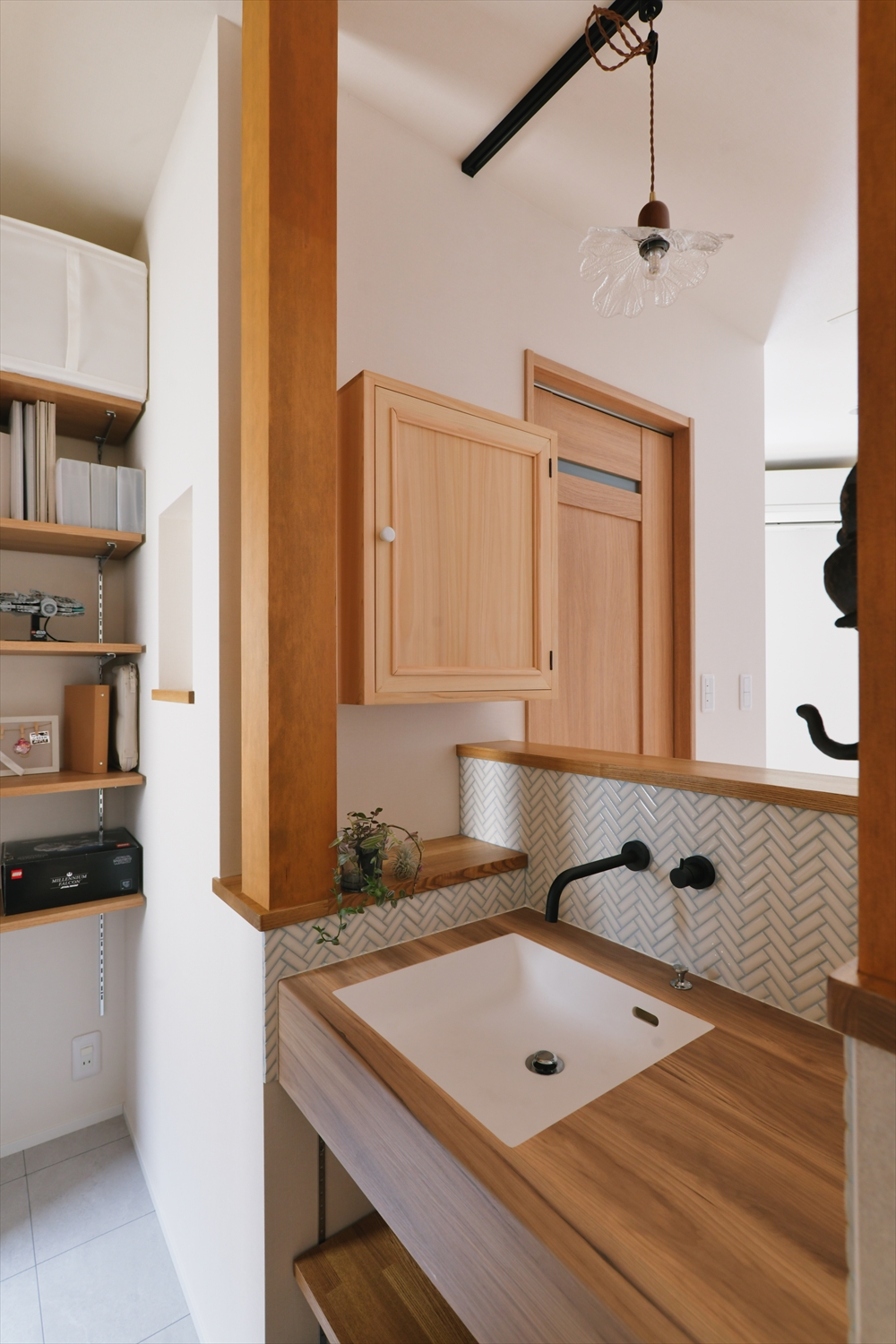 立ち上がり部分のヘリンボーン貼りのタイルのさりげなさも「大人かわいい」ですね!