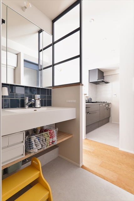 袖壁に設けた室内窓が、暗くなりがちな洗面室にやわらかな光を届けます。