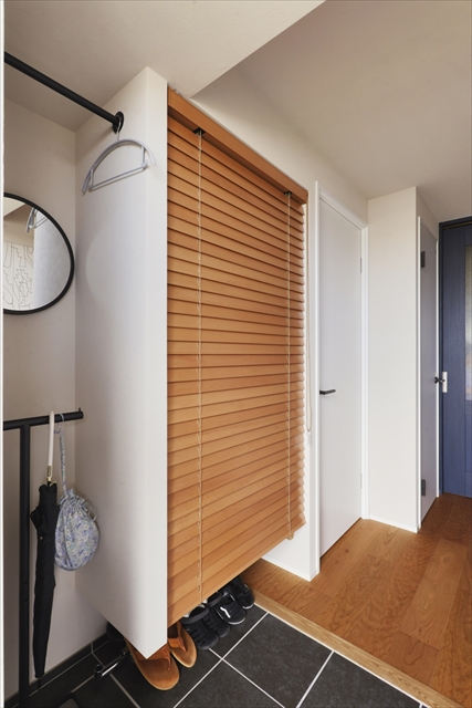 靴収納には扉ではなくウッドブラインドで目隠し。