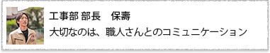 そんな「最高の住まいづくり」のために、私たち施工管理は、お客さまや職人さんたちとコミュニケーションをとりつつ、作業工程の管理、職人さんの手配や資材の発注を行ないます。