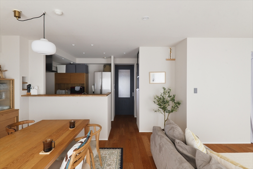 キッチンは対面式のレイアウトを生かしつつ吊戸棚をなくすことで、閉塞感をなくし、明るくオープンな雰囲気に。LDとの一体感が高まり、お子様の見守りもしやすくなりました。