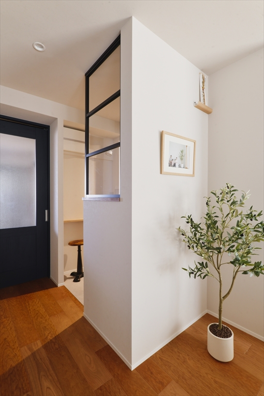 奥まっていた洗面室は、アクセスしやすいアウトベイシンスタイルに変更しました。お子様にもお客様にも気軽に洗面台を使っていただけます。袖壁に設けた室内窓がインテリアのアクセントになり、洗面スペースの明るさアップにも役立っています。