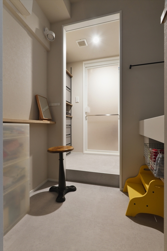 洗面室の入り口にはもともと段差がありましたが、配管に工夫して床をフラットにつなげ、LDKとの一体感を高めました。脱衣室との間は引き戸で仕切ったため、お子様が成長してからも入浴中のプライバシーを自然に保てます。