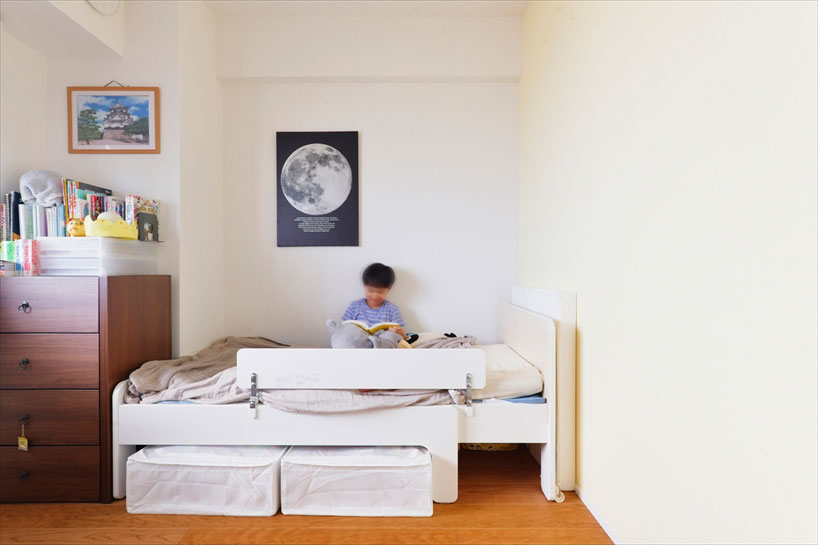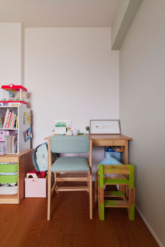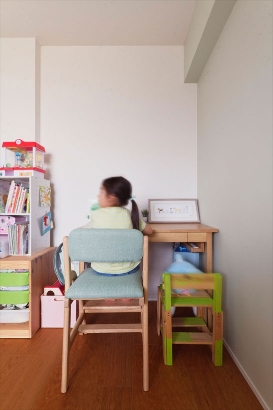 個室が必要とお考えになりつつ、お子様たちはまだ小さく、特に下のお嬢様は個室がいらないかも、という状況でした。そこで、将来ご夫妻の寝室をリビングの一角に設けられるよう壁や天井の下地だけ準備し、それまでは2LDKの間取りのまま広々と過ごせるプランをご提案しました。
