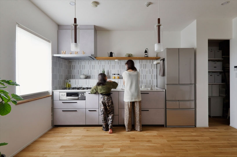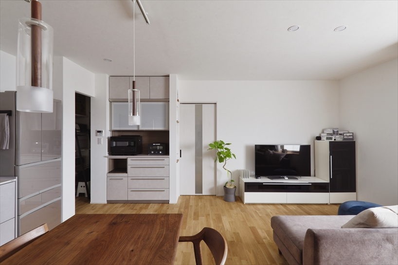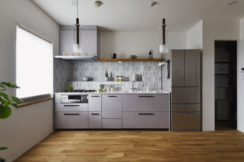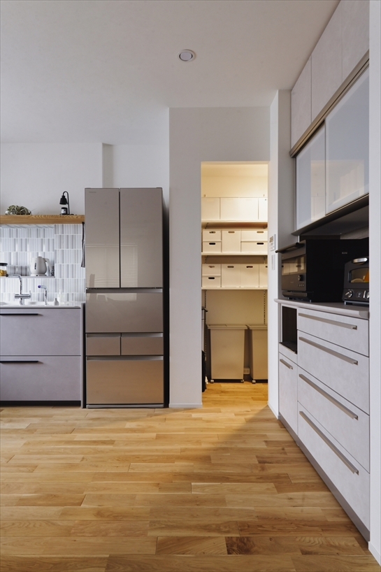 もともとは対面キッチンを検討されていましたが、リビングの広さを優先させたいと、壁づけキッチンのプランを選ばれました。Ⅱ型キッチンなどと違って、壁づけキッチンには背面収納がないため、パントリーを併設して収納量を補っています。