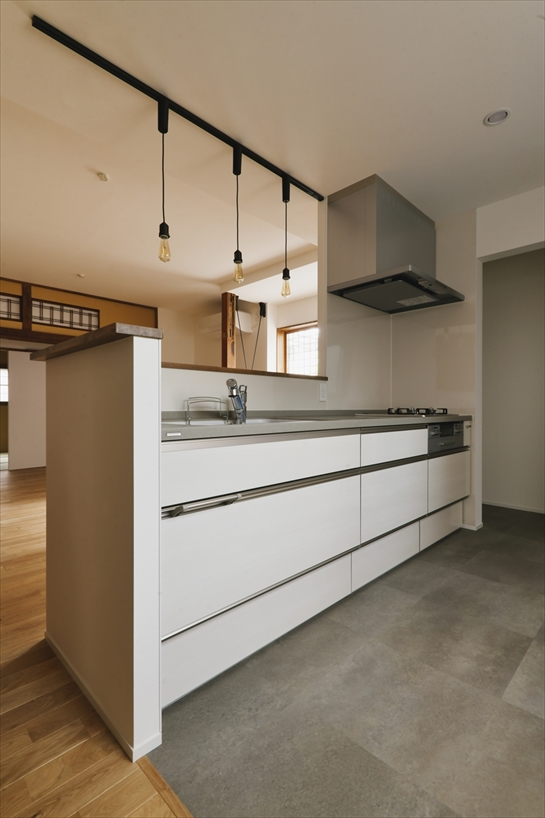 キッチンの床には使い勝手なども考慮しグレーのフロアタイルを採用。落ち着きのある洗練された空間に仕上がっています。