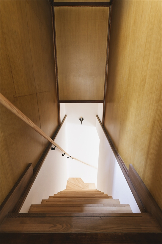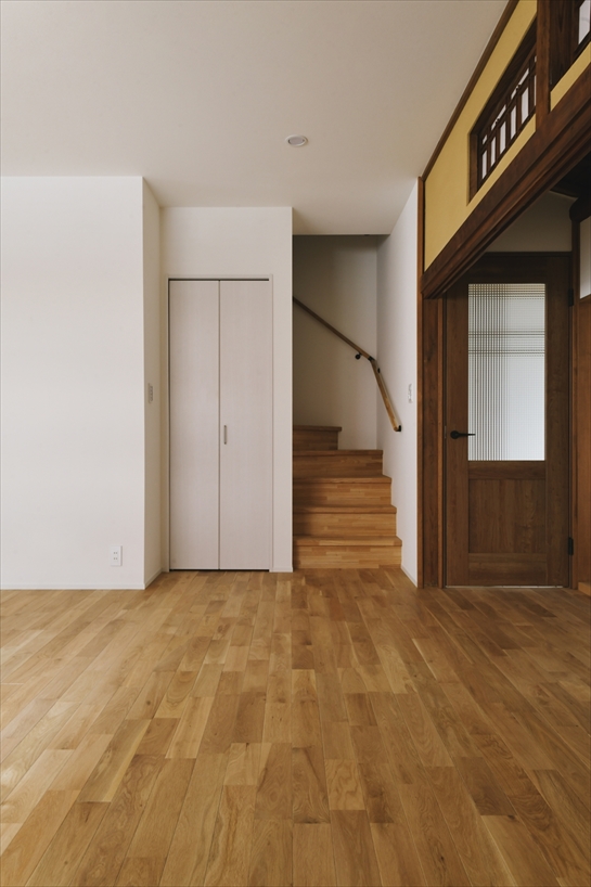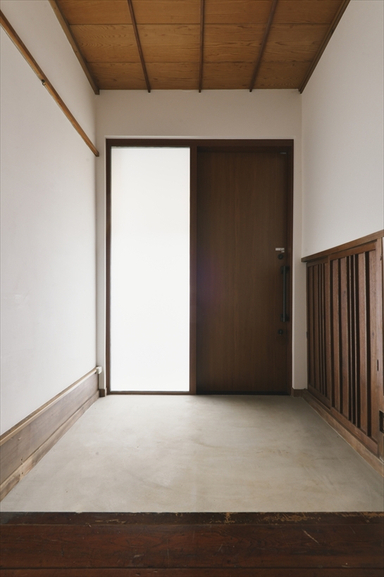 玄関からリビングに繋がる既存廊下は雨漏りや傷みもありましたが、端正な表情が新しい暮らしに自然に調和するように、丁寧に部分補修しています。