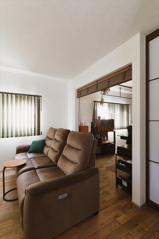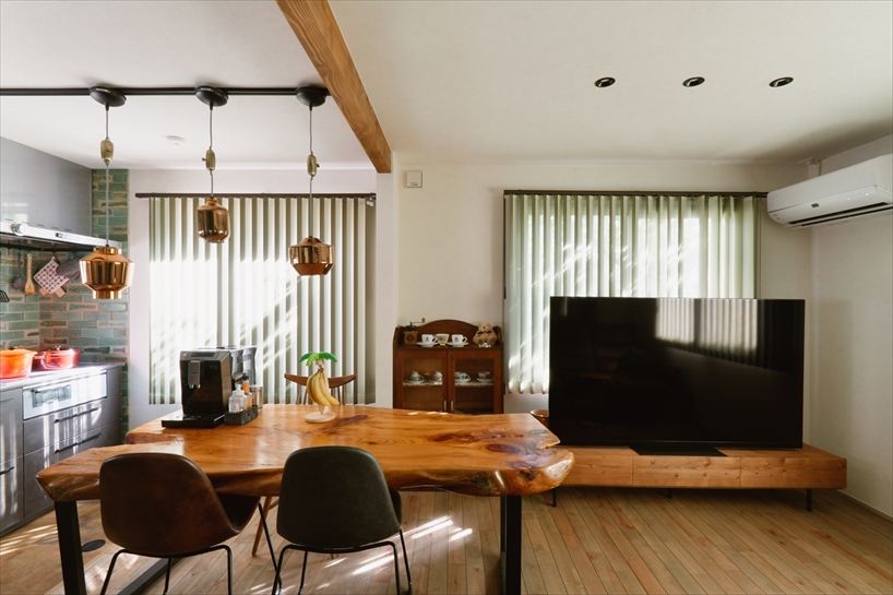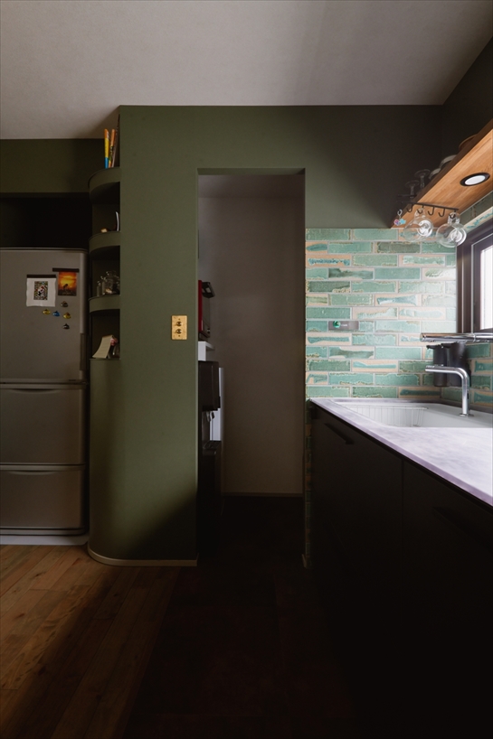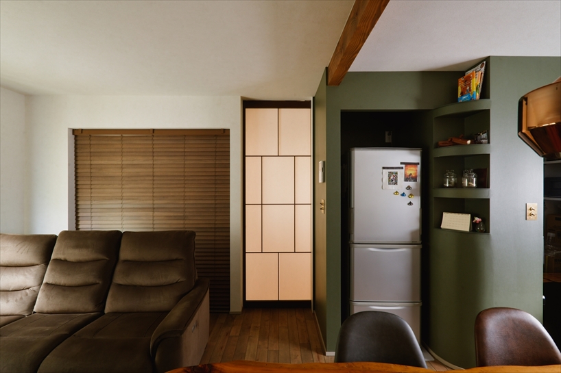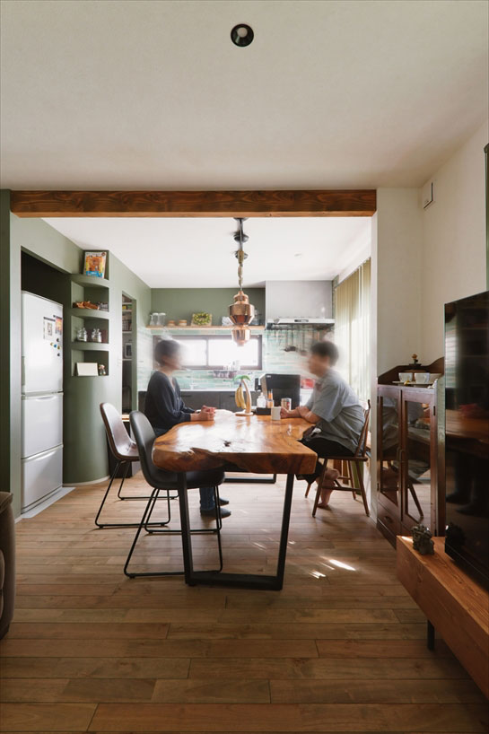 まず、南側のふた部屋を仕切る壁を補強しながら抜いてLDKのスペースを確保。LDをできるだけ広く取るため、キッチンは壁付きを採用しました。妻のM様のお父様から受け継いだ一枚板のダイニングテーブルをはじめ、長年、使い込んできたお気に入りの家具と調和するコーディネートはご夫妻が好きな“昭和レトロ”がテーマ。深みのあるくすみグリーンのアクセントや障子戸のような建具がその雰囲気を盛り立てます。
