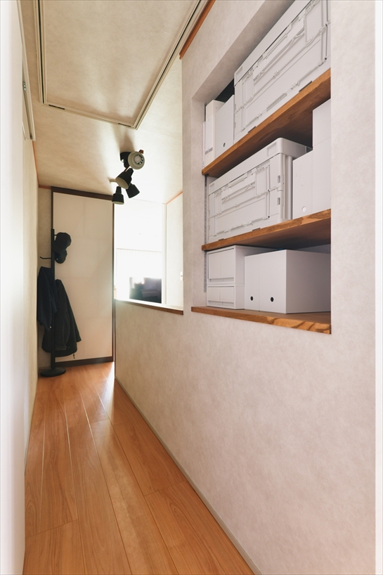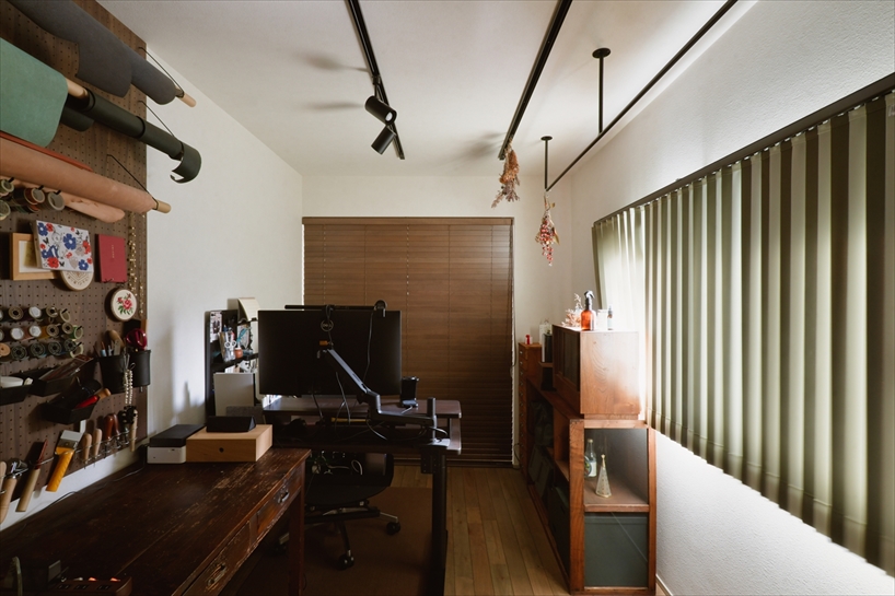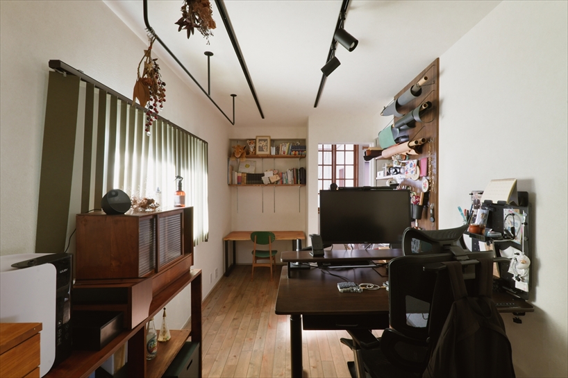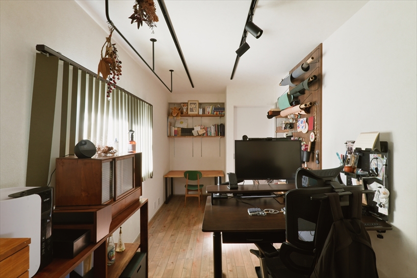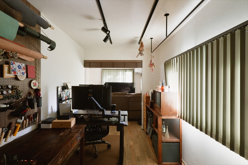 多趣味な妻のM様のためのワークスペースはリビングと緩めにつながる位置に。本格的なレザークラフトに必要な作業スペースを備え、材料や工具は壁面を使ってスッキリまとめられています。日当たりのよい窓辺には室内干し用のハンガーバーを取り付けました。