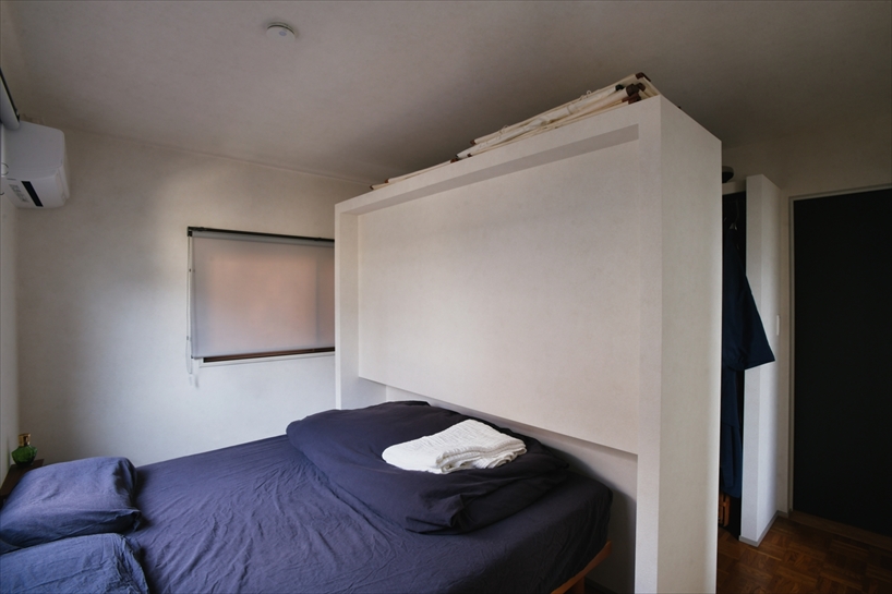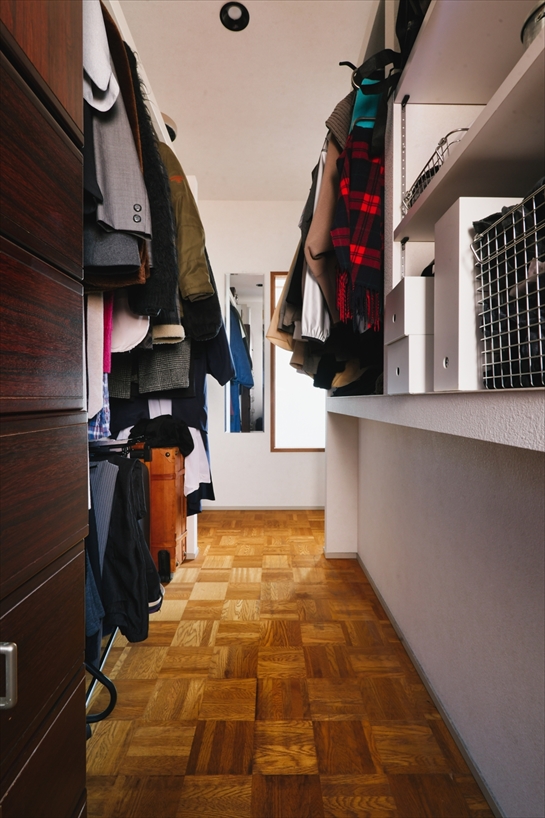 北側の部屋を主寝室に。既存のパーケットフロアは現在では懐かしく、ほのぼのとした材料なので、ご夫妻の希望でそのまま残しています。空間の一部を使ったWICはベッドが入るように形を工夫し、ご両親が使われていたタンスも収まるように調整しました。