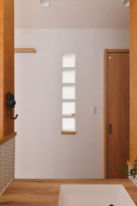 内装は妻のM様の好みを反映し、じっくりと選ばれたクロスやタイルなどでお好きなイメージを表現しています。前回のリノベーションで好評だったガラスブロックを階段の壁に採用し、遊び心あるスポットに。