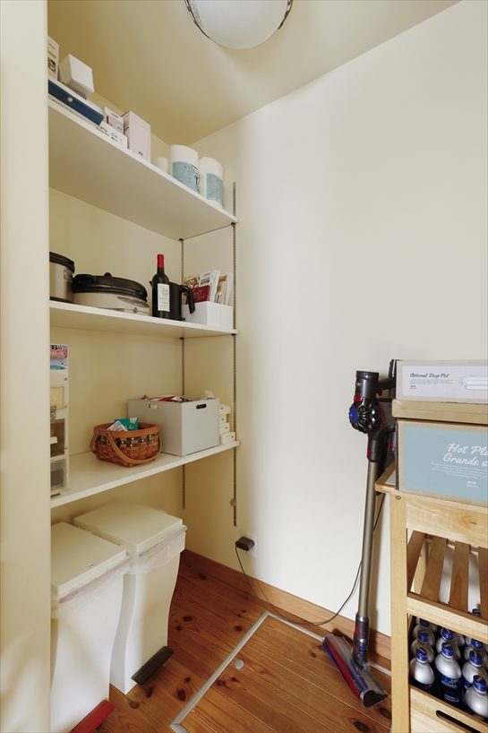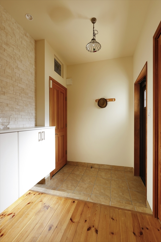 玄関では圧迫感のあったSICをカウンタータイプの靴箱に変更し、壁面にエコカラットを採用。向かい側には天井までの収納を設けつつ、扉をリユースしてコストカットに役立てました。