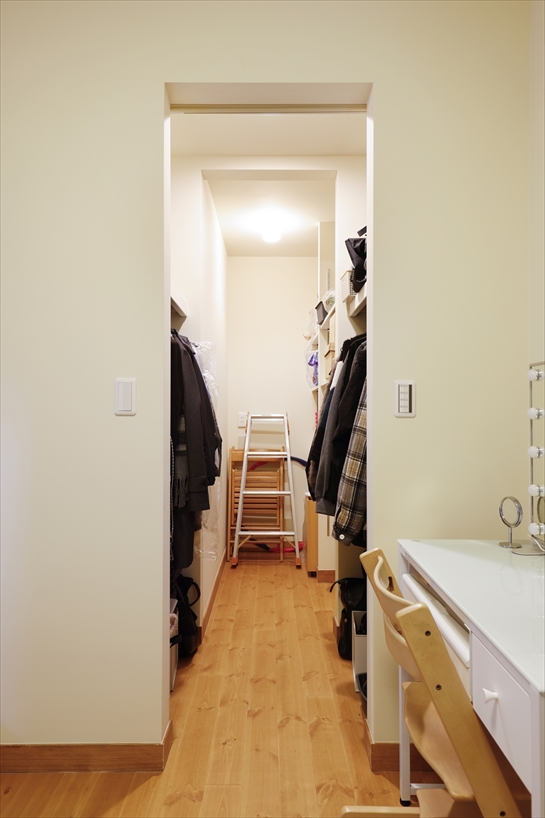 小上がりは洋室にしてダイニングとフラットに繋げ、フルオープンにできる折り戸で仕切りました。身支度のできるパウダールームとして使いたいとのことで、押入れだったスペースにはゆったりしたWICを設けています。
