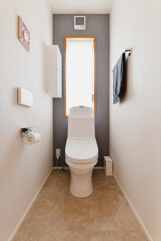 水廻りでは既存の構造柱の間に引き戸をプランし、トイレを廊下側から入れる個室に。窓の周りにはカラークロスを採り入れ、快適に過ごせる空間を演出。洗面室では「ミナ・ペルホネン」のタイルがアクセントに。アイロンや掃除機などをしまえるよう、収納も充実させました。