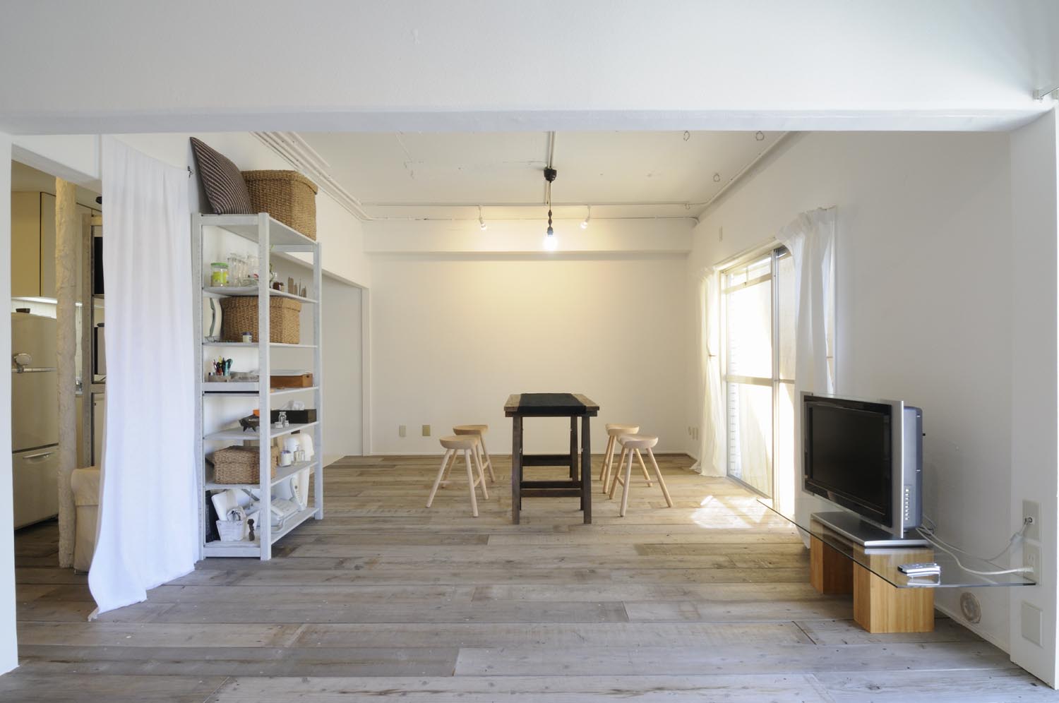 間仕切りをなくして、広い空間を。天井や壁の仕上げを取り払い、躯体をあらわしにしたい。電気や配管が天井に見えているような・・。床もフローリングではなくもっと荒い感じに。