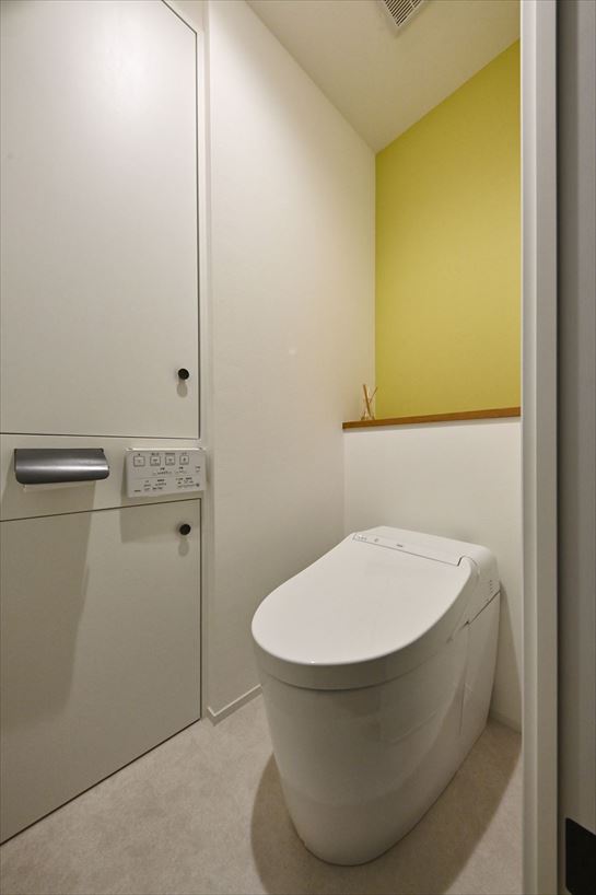 斜めに仕切られた水廻りをどう活かすかがポイントでした。
