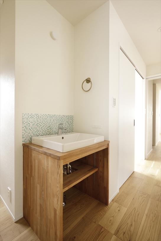 妻のYさまのご希望で、2階ホールには手洗いスペースを設置しました。階段手すり壁の周囲には本棚をご提案。ご家族共有のライブラリーとして活用できます。