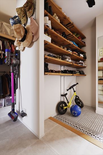 そこで、玄関横の個室を、シュークロークとウォークスルーのファミリークローゼットに変更。