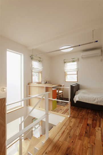 2階へと上る階段には顔がちょこんと出せる程度の小窓を設け、いつでも顔をみて会話をする事ができるようにしました。2階から3階への階段はスケルトンで、開放感をだしました。