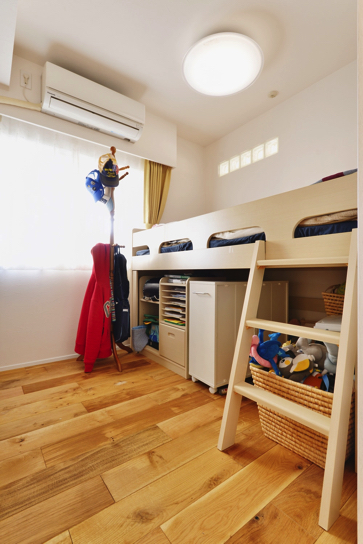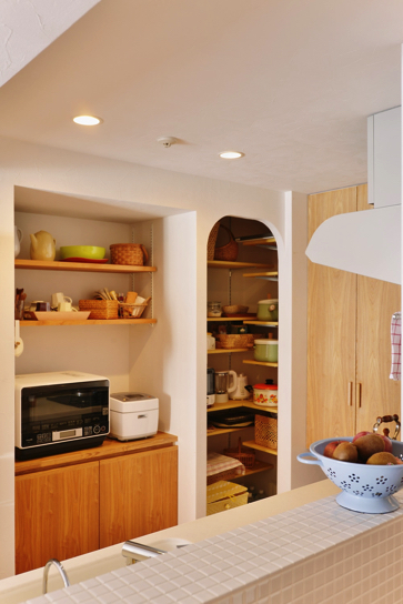 内部に柱などの凹凸が多く、部屋の形状も変わっていたため、もともとの形を生かしながら使いやすい間取りをプランニングしました。キッチンは対面にしてオープンにすることで、開放感とリビングとの一体感を演出。さらにリビングを広く使いながら、主寝室や子ども部屋など必要な間取りも確保したいということから、大きな間取り変更は行わず、部屋の仕切りを少しずつずらすことで、リビングを広くしました。また、各部屋に収納も欲しいということから、部屋の形状を生かした収納スペースを造作。限られた空間を有効活用しています。