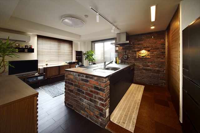 アルダー材で造作されたカウンターは奥行きもたっぷり。ハイチェアーを合わせて老舗バーのカウンターのような落ち着きある佇まいに。キッチンの壁の一部と、カウンターに使われているヴィンテージのスライスレンガがいい味を出しています。「レンガはぜひ使いたいとこちらから依頼しました。子どもの頃テレビで見た『ブーフーウー』の、強いレンガの家にずっと憧れていて」とMさん。レンガの壁の一部はニッチ仕様になっており、内部に照明も設置。夜はさらに味わい深く、豊かな時間を演出します。