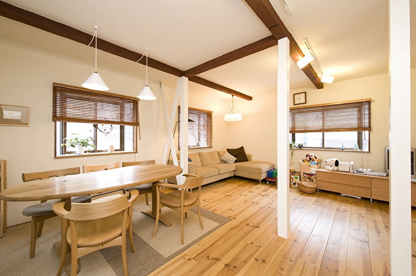 天井、壁はお客様で珪藻土左官を行いました。自然なパターンで包まれた部屋には、むき出しとなった柱、梁、筋違い、そしてお客様でご用意された無垢のダイニングテーブルが自然に溶け込んでいます。