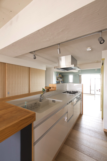 緑がたくさんの閑静な住宅地に建つマンションで、3面に窓がありました。その窓から、陽のひかりや風が流れこんでくるお部屋を、お子様の姿を見守れる大空間のLDKにしています。キッチンを中心に、ぐるりと回遊できるレイアウトで、これからの家族の成長に併せて、引き戸でしきったり、個室にしたり・・・と、変化を楽しめるよう可変性のあるフレキシブルな家にしました。