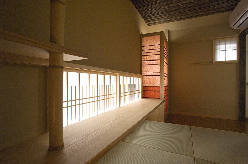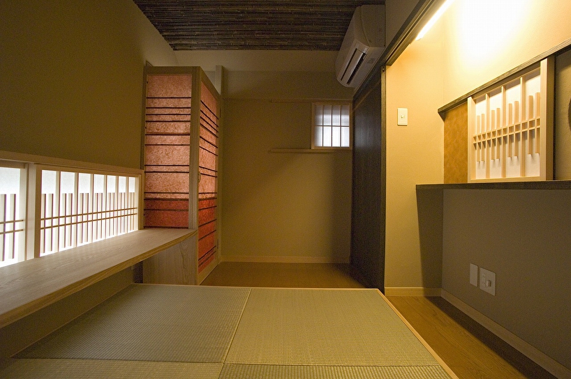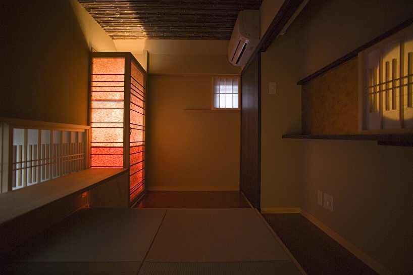 3階への階段を上ると黒く塗られた木の引き戸があり、中に入ると正面に、 既存のアルミサッシの目隠しと照明を兼ねた和紙の屏風が、昼は外の光を柔らかに、 夜はほのかな明かりで部屋を照らしてくれます。その隣には、低く抑えた横長の窓と書院風の カウンターがあり畳に座って目の前の木々や花を見ながら読書などが楽しめます。 寝ころんでも緑が楽しめます。