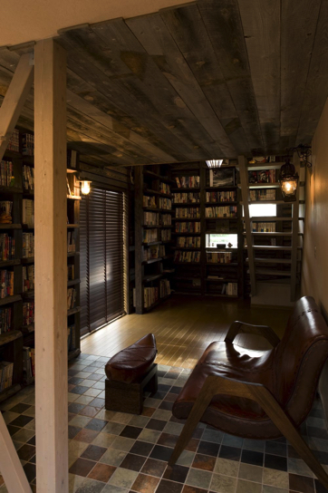 壁面や床の一部にもモザイクタイルを貼ったり、天井には古材を使用、通常のフローリングやクロス仕上げの中に異素材を突如使用しインパクトのある本棚にも負けない床や壁の仕上げとなっています。