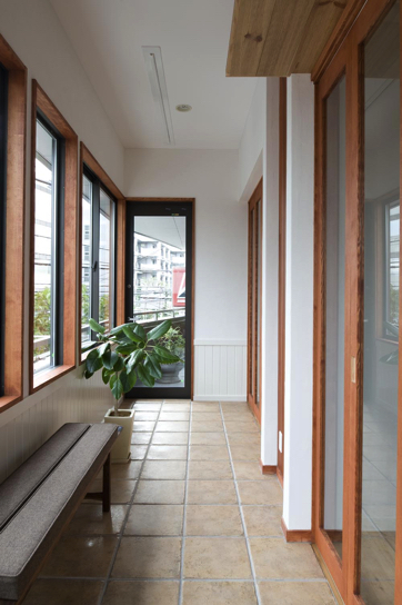 防音と物干しとしての機能を持つサンルームは、白い腰壁とタイル貼りで、御主人の趣味がサーフィンということもあり、湘南風に。