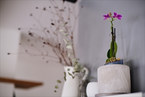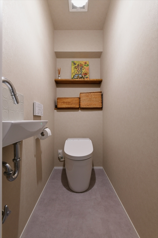 フロア中央のパイプスペースがプランの制約になりましたが、あえてそれを挟む形でカウンターデスクを造作。パイプスペースがデスクをゆるく仕切る役割をしてくれています。また、お子さんの作品や雑貨などのディスプレースペースも兼ねた「魅せる柱」にも。