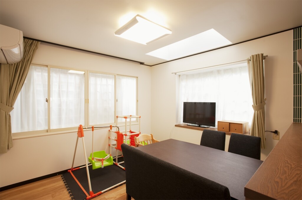 ウッドデッキに面した明るいリビングはだんなさまのお気に入り。 既存の出窓は掃き出し窓に変え、ウッドデッキと出入りできるようにしました。ガレージのシャッター部分の段差はそのままベンチとしてウッドデッキに取りいれています。「ウッドデッキでお酒を飲みたい」という希望を叶えることができました。