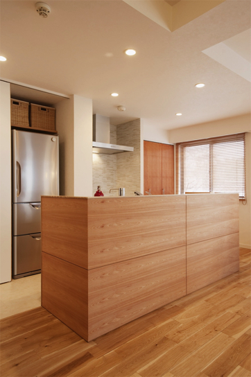 水まわりの使い勝手をよくするために、キッチンはアイランドにすることで家事動線をアップさせて、洗濯機は狭い洗面室から広くしたキッチンに移動しました。