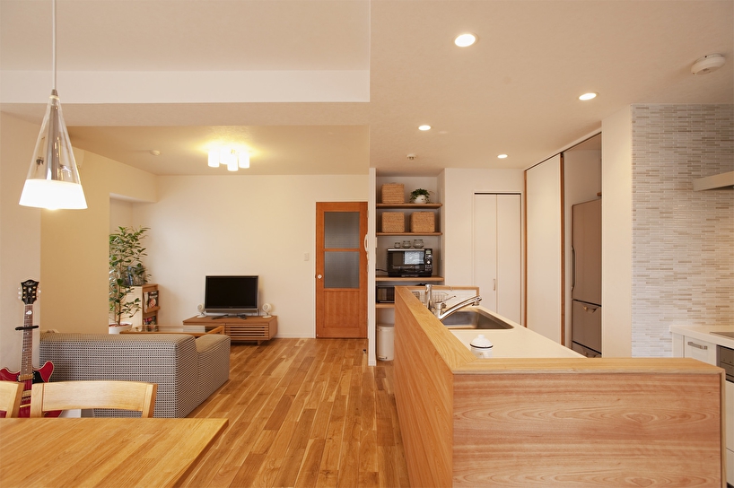 南北に長い間取りで、部屋の奥まで光が届かなかったので、壁や天井は白を基調に、床材や建具などの木材は明るい色を選んでいます。