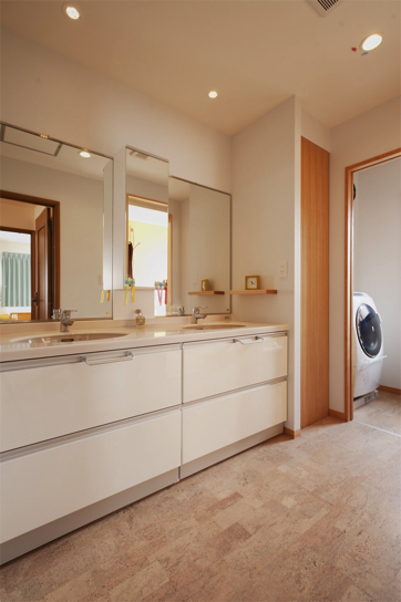 自然素材を使った雰囲気が好きとの事でしたので、1階リビングの床は床暖房に対応したオーク、キッチン、トイレ、洗面室などの水まわりはコルクタイル、プレイルームは木目が美しいアカシア、造作の建具にはタモ材を・・・。自然素材をふんだんに取り入れました。