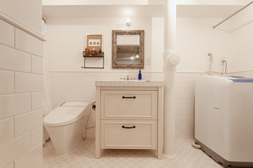 水回りの位置は大きく変えてはいませんが、バス・トイレ・洗面と一体化させました。バスは在来風呂、洗面や床にもタイルを使用し、空間全体に上品な質感がでています。