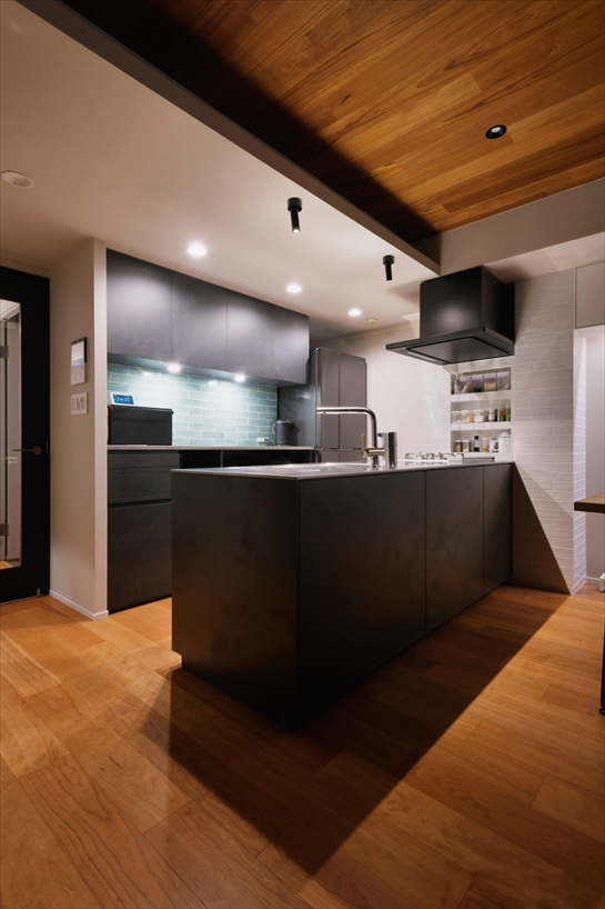 キッチンもシックな黒を選ばれ、吊り戸棚のないオープンスタイルに。ゴミ箱スペースは臭気を防ぎつつワンアクションで捨てられるフラップ付きのデザインです。