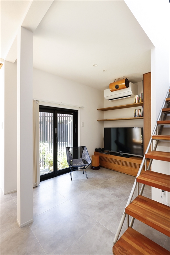 インテリアは全体的にモノトーンを基調としたシンプル・モダン。階段や天井のルーバー、梁などの木目が温もりのあるアクセントになっています。
