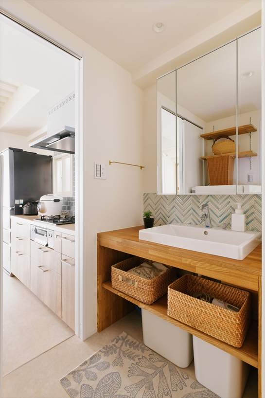 キッチン・水回りは動線を考えて配置。キッチンから直接水回りにアクセスでき、回廊側にも出られるので朝の家族みんなの準備時間もスムーズです。